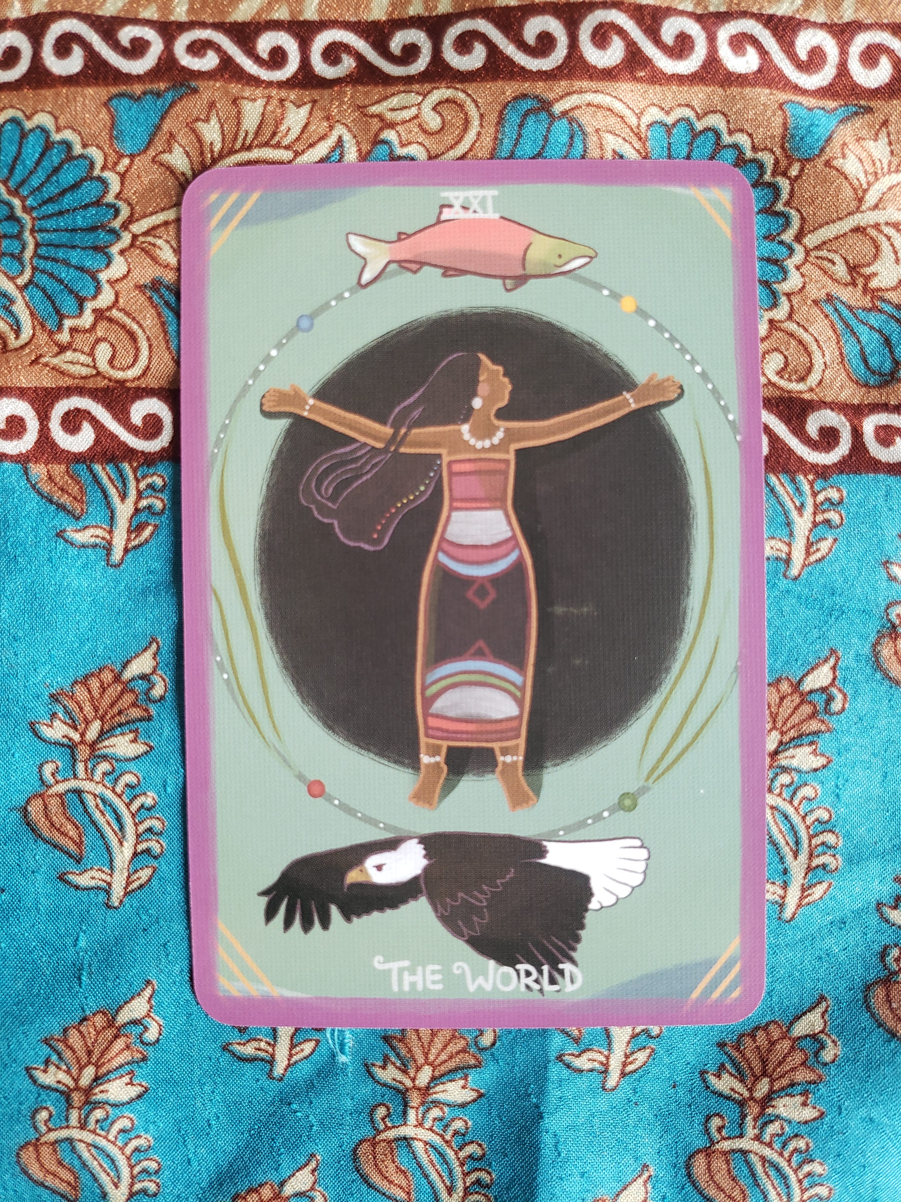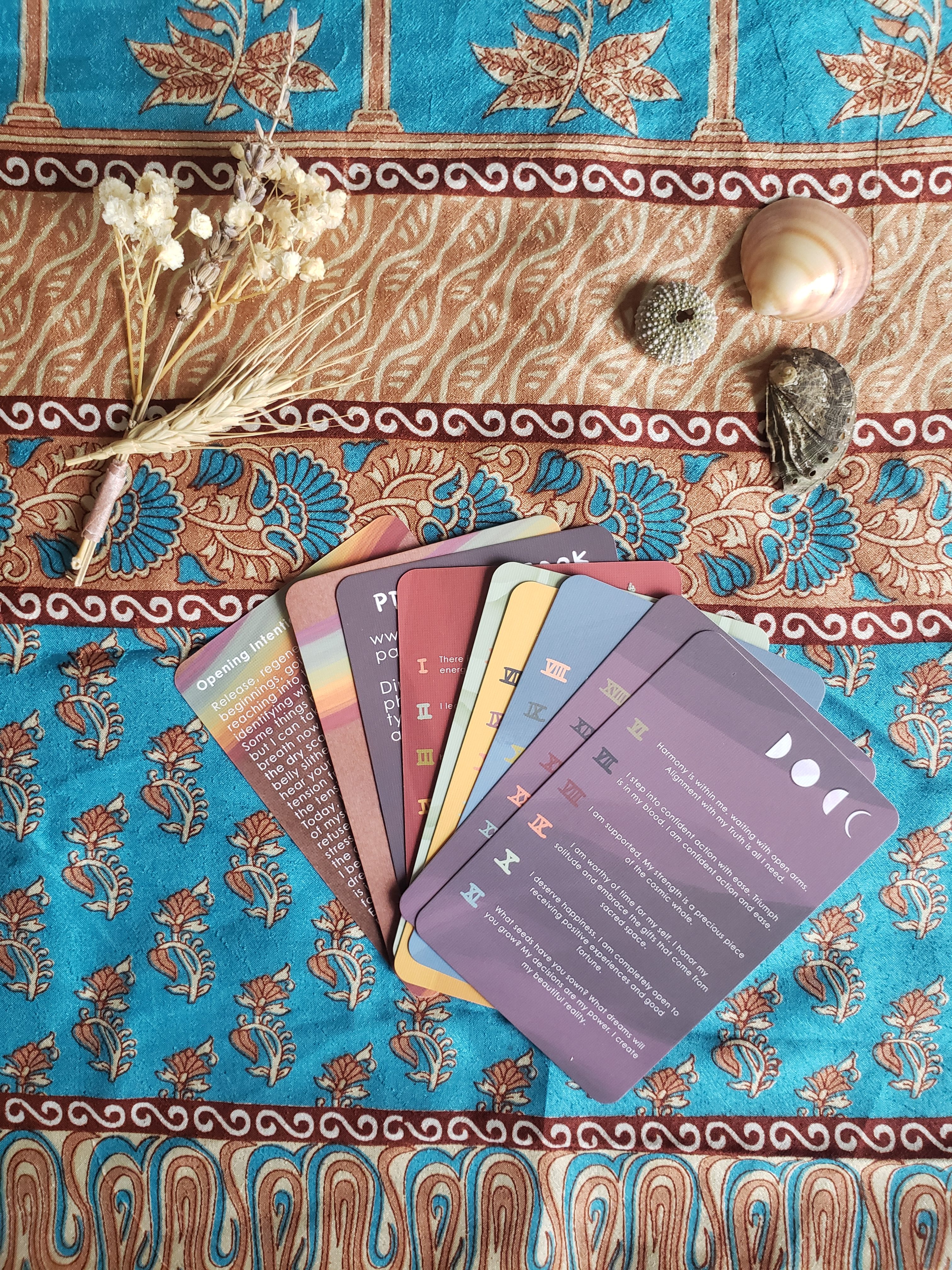 The deck is a classic 78 card deck. Some of the cards are lightly based on the Rider-Waite deck, however many of the illustrations are the result of complete surrender to creative/spiritual process. Motifs and symbols, along with colors, have been used throughout the deck to make for easy recognition and to assist with remembering the meanings of the cards.