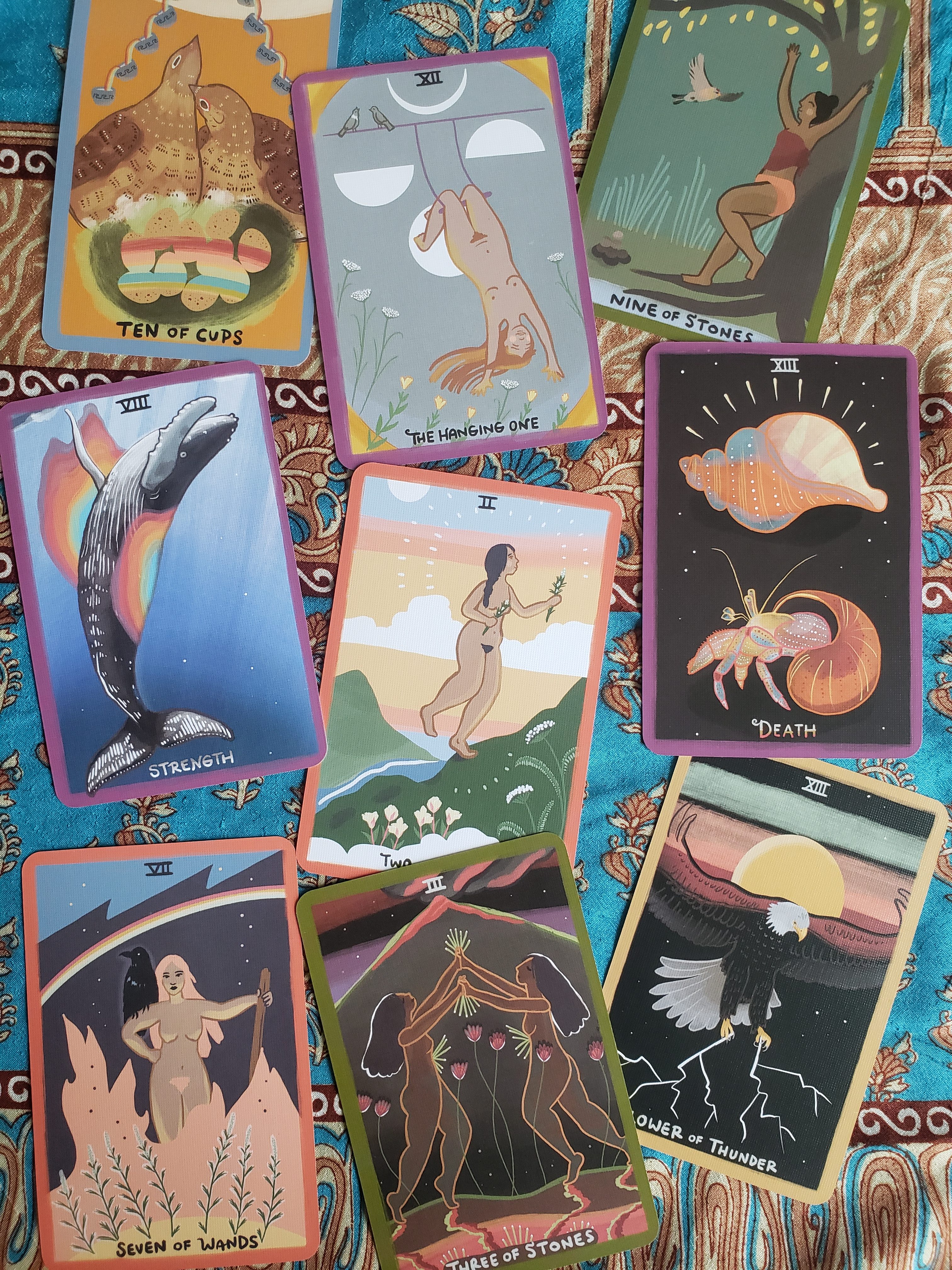 The Gentle Tarot also exhibits mostly people of color. As an indigenous woman, Mari feels it is important to create work with representation because it too often is lacking in the mainstream. We should love our bodies as they are and be proud of our history and proud of whatever skin color we have.